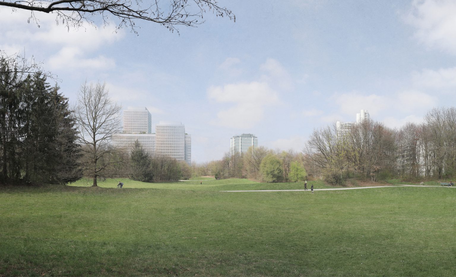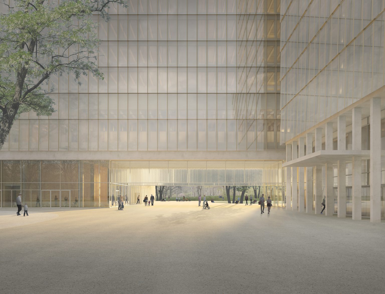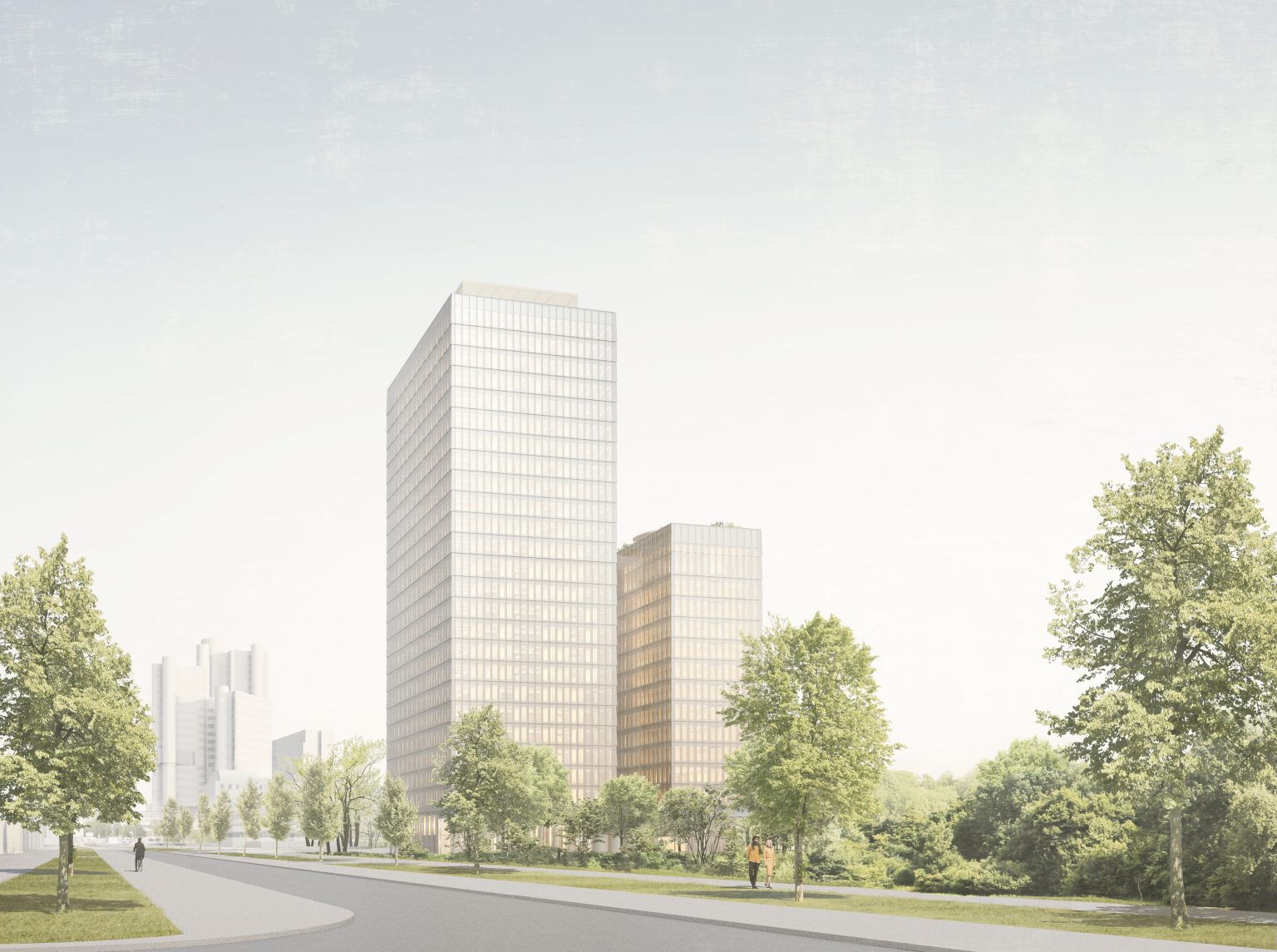 Der Entwurf von David Chipperfield Architects besteht aus drei Baukörpern: zwei Hochhäuser mit 26 und 17 Geschossen sowie einem verbindenden Riegel, der die Volumen räumlich und funktional zusammenführt. Während der höhere Turm straßenseitig die Abfolge der Hochhäuser entlang der Richard-Strauss-Straße fortsetzt, öffnet sich das Ensemble zum Anger und schafft einen fließenden Übergang zwischen Stadt und Landschaft. Diese klare städtebauliche Setzung erfordert eine präzise Koordination von Baukörpern, Erschließung, Tragwerk und Freiraumplanung, die wir modellbasiert zusammenführen.