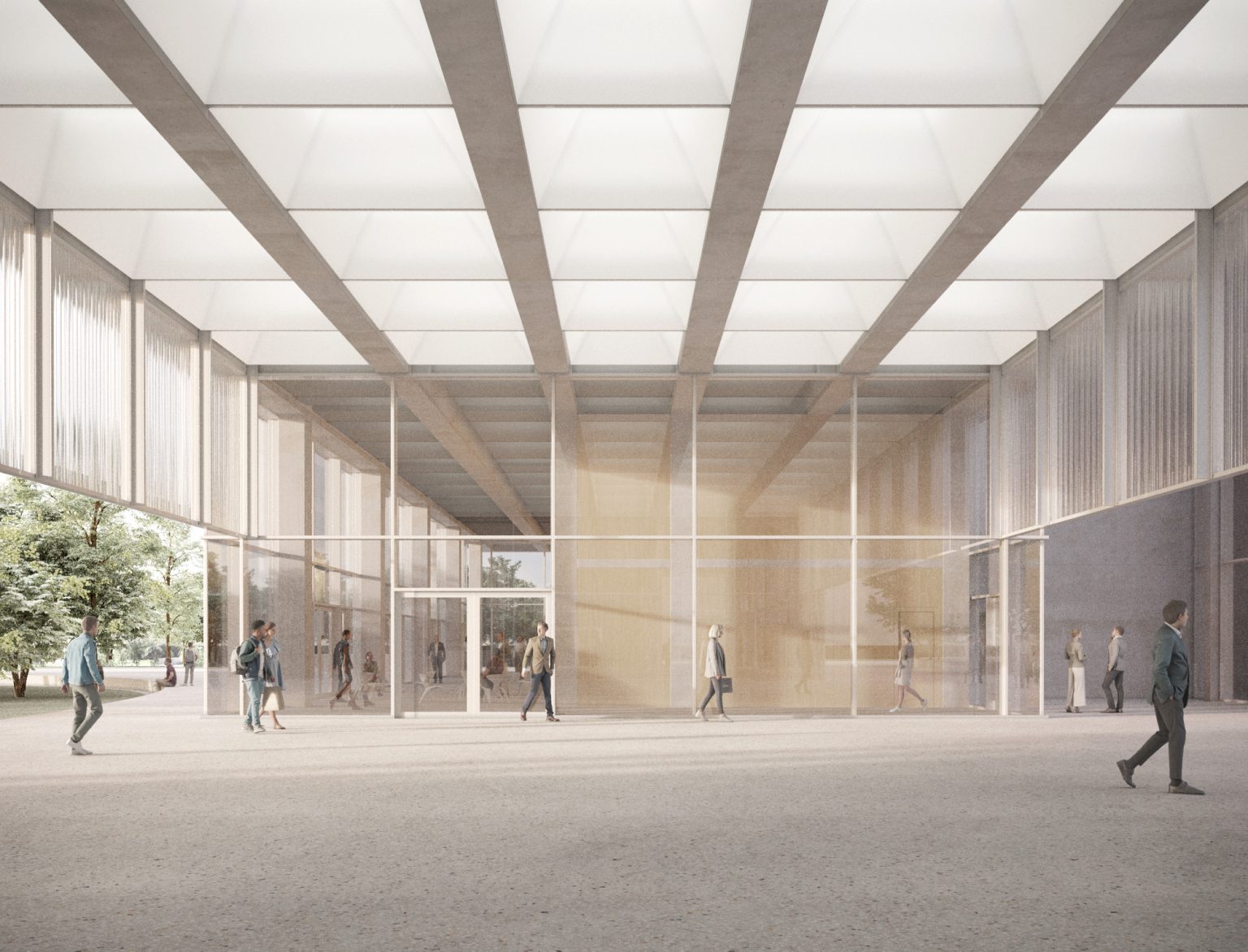 Ein zentrales Merkmal des Projekts ist die Holz-Hybrid-Konstruktion. Sowohl der Verbindungstrakt als auch der 17-geschossige Turm nutzen Brettschichtholz für Stützen und Träger, ergänzt durch weitere konstruktive Systeme. Diese Bauweise verbessert die Ökobilanz des Gebäudes, schafft ein gesundes Raumklima und ermöglicht gleichzeitig eine hohe Flexibilität der Grundrisse. Für die BIM-Gesamtkoordination bedeutet dies eine besonders enge Abstimmung zwischen Architektur, Tragwerksplanung und technischer Gebäudeausrüstung, um Materialwechsel und Detailpunkte frühzeitig und konsistent zu klären. Das offene Erdgeschoss bildet das Bindeglied zwischen Stadt und Park. Diese Verzahnung von Innen- und Außenräumen stellt hohe Anforderungen an die Koordination von Architektur, Landschaftsarchitektur und Gebäudetechnik, die in den digitalen Modellen transparent abgebildet werden. Auch das Nutzungskonzept ist vielfältig angelegt. Diese Nutzungsvielfalt erfordert eine präzise Koordination von Erschließung, Brandschutz, TGA und Tragwerk.
